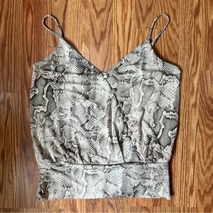 White House Black Market's chic asymmetrical wrap top in luxurious tan and cream features a subtle snakeskin print for a refined look.