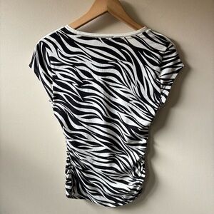 White House Black Market zebra print short sleeve top. Ruched sides make this top very flattering! Size XS but has stretchy material so could probably fit up to a M.