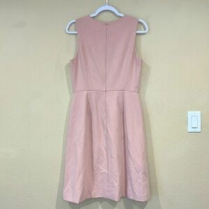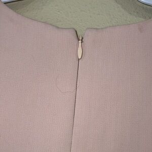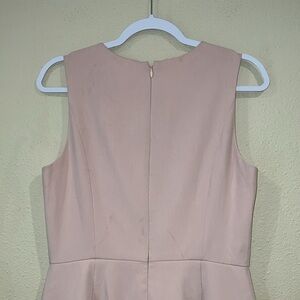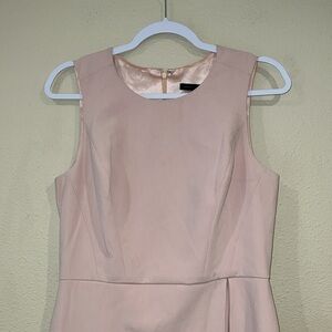 This stunning sleeveless dress in a soft pink hue features an asymmetrical wrap design with a stylish slit, perfect for cocktail parties or as a wedding guest. The sheath silhouette and crew neckline offer a chic and modern look, while the fitted bodice enhances your figure with elegance. Back zip and in gently used condition
