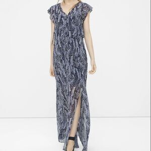 White House Black Market feather design, flutter sleeve, blk wht blue maxi XXS