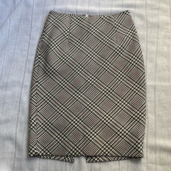 White House Black Market pencil skirt. Size 2. Fully lined. Leg slit in the back. This pencil skirt is the elevated bottom you need for your work attire. It has a slimming fit and would look fabulous with ballet flats and a solid blouse. Zips and clasps in the back. Beautiful condition.