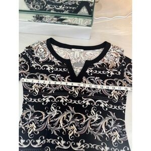 WHBM dress with back white and cream pattern.