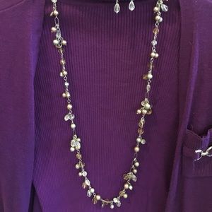 White House Black Market silver tone nickel-free metal necklace+2 pair matching dangle earrings; various champagne colored crystals, beads, and pearls are a nice neutral shade that will compliment many outfits (costume). Necklace is adjustable from approximately 20” to 21.5/22”.