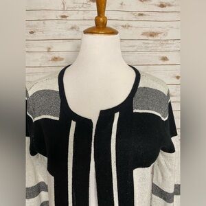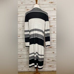 Black and white striped pattern; round neck; long sleeve; two front pockets; straight hem