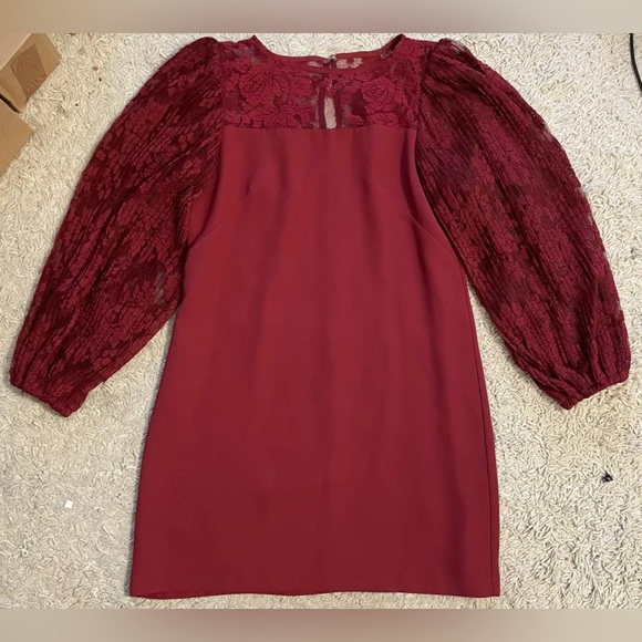 White House Black Market red wine Lace Cocktail Party Dress Women Size 8P 8 P. Lace sleeves with elastic at the ends. Short mini dress. Stretchy. Zipper in back. Excellent condition.