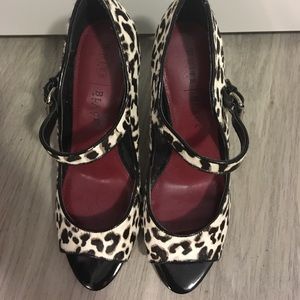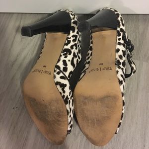 Size 9 great condition White House black market pumps leopard fur with black patent accents and red insoles. Other than wear on the bottom of the shoes you would never know they were worn.