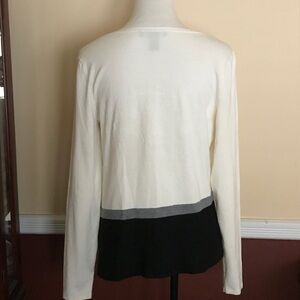 EUC cream, gray and black WHBM sweater in excellent condition. Size large, fabric content 71% rayon, 29% nylon. Machine wash cold, lay flat to dry. Measurements laid flat are approximately 19.5” armpit to armpit, 28” length, 27” sleeves. Side slit at bottom.