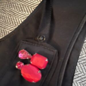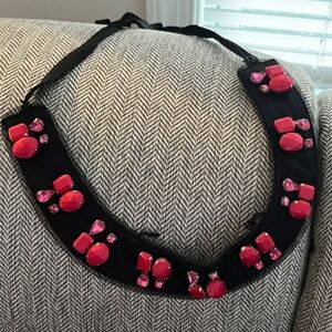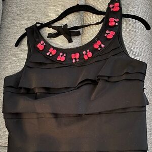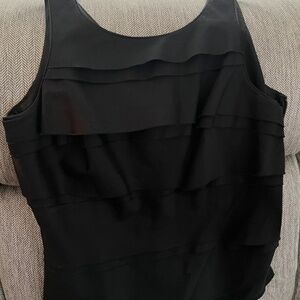 White House Black Market top with removable neck band/necklace. It has snaps (difficult to see in picture) that will hold in place inside shoulder. Each piece can be worn separately. It has a hidden side zipper, color is black and is machine washable except for the removable neck band/necklace. Size 6