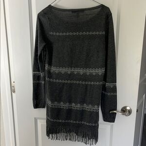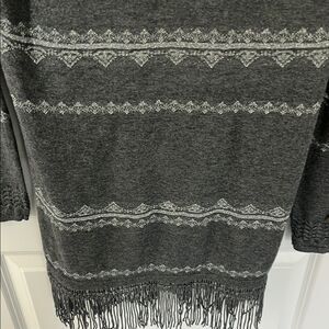 Stylish gray sweater dress with fringe detail. Features a patterned design, Subtle Rhinestone Accents with Metallic Threading