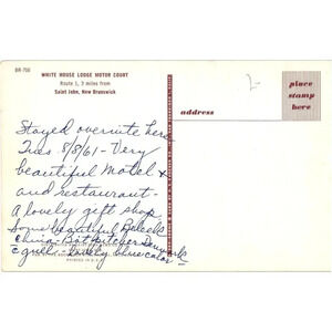 Welcome to the White House Lodge Motor Court, a hidden gem just 3 miles from Saint John, New Brunswick. This charming postcard captures the cozy allure of this motor court, ideal for travelers seeking a peaceful retreat.