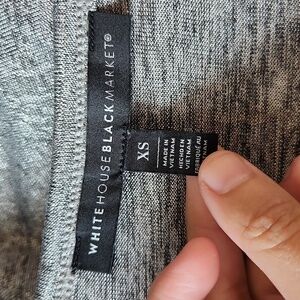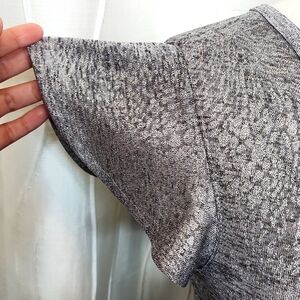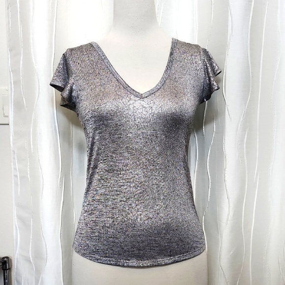 White House Black Market Size XS Silvertone Shiny V-Neck Short Sleeve Top. Bust is 18 inches across. See all pictures for actual condition. Feel free to ask questions.