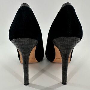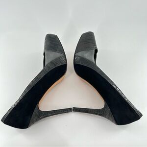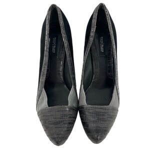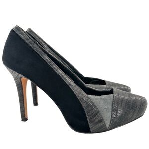 White House black market womens heels size 7.5 black gray leather suede snakeskin embossed platform stilettos