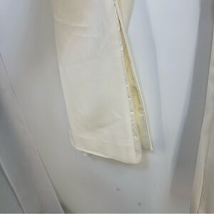 9.5" high slit in the pants hem with a shiny satin trim along ths edge of the slit, and also on the waistband