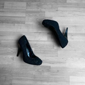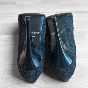 Elevate your style with these stunning White House Black Market heels. The black textured fabric, accented with sparkles, is perfect for a dressy or business occasion.