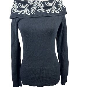 White House Black Market sweater. Black with tan scroll print. Off the shoulders. Long sleeves. Excellent preowned condition. Size Xsmall.