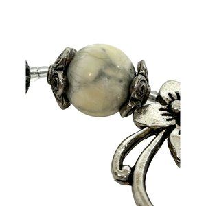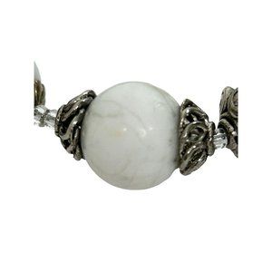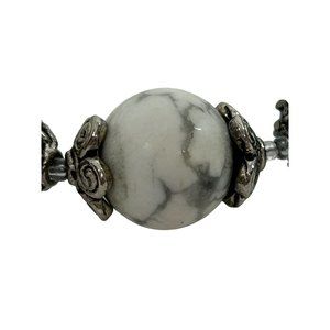 White Howlite Gemstone Beaded Bracelet Handcrafted Silver Tone Floral Grey Whte