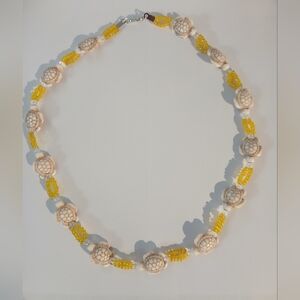 Charming necklace featuring cream turtle beads and vibrant yellow accents. Perfect for adding a playful touch to any outfit. This necklace was crafted in Key Largo, Florida Keys, and measures 18.75 inches.