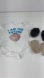 Adorable white onesie with colorful globe design. Includes three pairs of socks in black, beige, and gray.