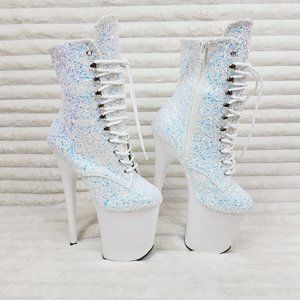 White Ice UV Glitter 8" Platform Heel Ankle Boots Flamingo