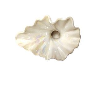 The White Iridescent Flower Vase by Rush Low is a vintage piece of art glass with a ruffled edge design. The glossy finish and art glass production style add to its unique and decorative appeal. Signed by the brand Rush Low, this original vase features a white color that will complement a variety of floral arrangements, making it a stylish and elegant addition to any home decor.