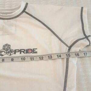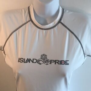 White Island Pride rashguard, pullover, short sleeves, 4 way stretch, bonded thread for extra strength, UVA and UVB protection from the sun, in good pre-owned condition, only worn a couple of times. *one tiny snag on center back, hard to see it, see last photo*