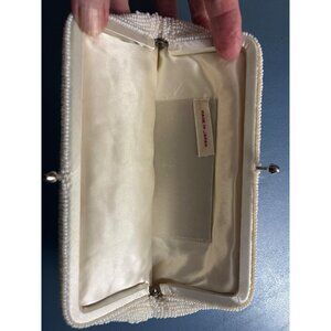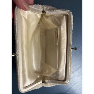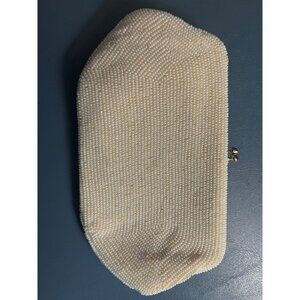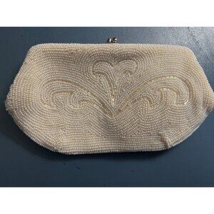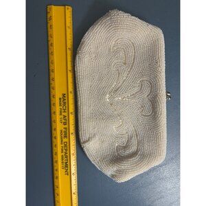 Elegant vintage clutch purse with intricate ivory beaded design. Features a kiss lock closure and satin lining, perfect for evening events. Compact size fits essentials while adding a touch of classic charm to your ensemble.