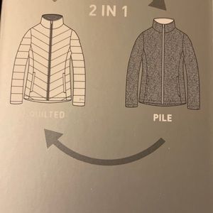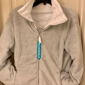 This is a reversible white/silver jacket. The quilted white side can be used as a rain jacket. The silver side is very soft. Never worn. From a smoke free home.