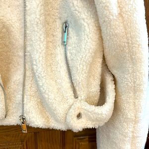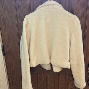 The exterior of this jacket is like a thick Sherpa with the interior being soft and silky.