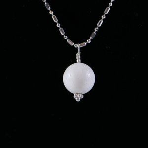 This necklace has a beautiful Genuine 12mm White Jade bead. It is carved from Buffalo Bone. The chain is 925 Sterling Silver, which is 100% Nickel Free.