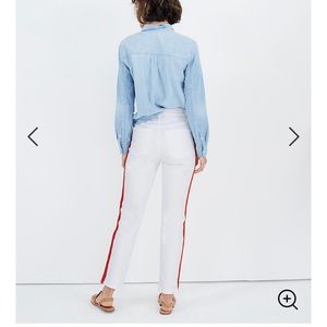 NEVER WORN!!! brand new high rise white with stripe down the leg jean from madewell. bought the wrong size and never returned. super comfortable straight leg, soft fabric. Madewell
