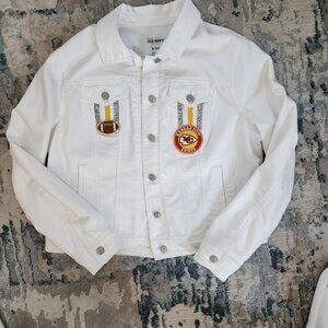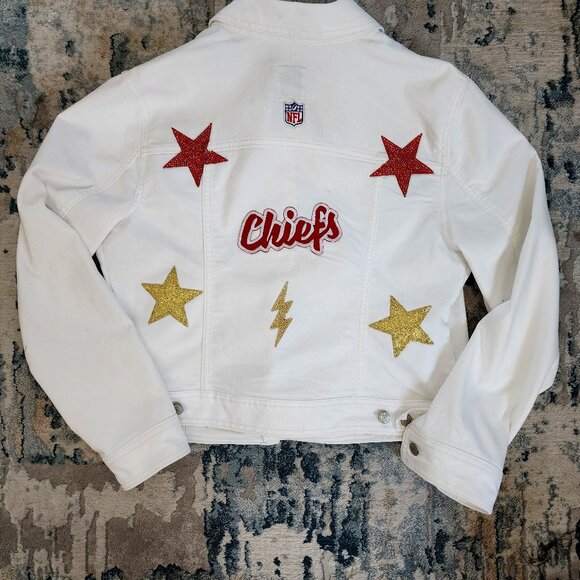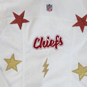 Very cute Jean Jacket with Jersey material sewed on with patches on jacket. lightning bolt and stars that glitter and sparkle as we win our season!