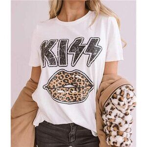 White KISS Fitted Vintage Graphic Tee Rock Band Short Sleeve T-Shirts Top
