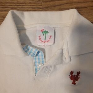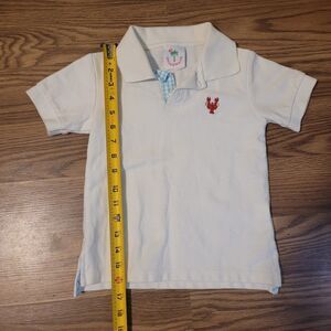 This adorable polo shirt features an embroidered crawfish logo and is in good condition. By Shrimp and Grits Kids. Size medium (5-6). 100% cotton.