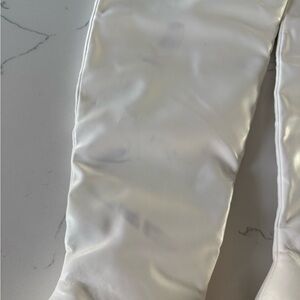 Elegant white knee-high boots with stiletto heels. Features a sleek design and side zipper.