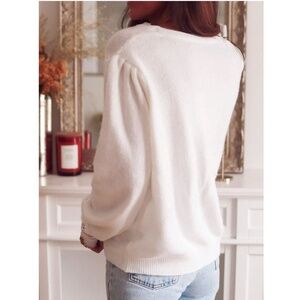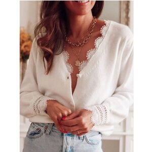 White Knit Button Up Cardigan Crochet Lace Trim Detailed V-Neck