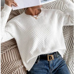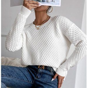 White Knit Drop Shoulder Round Neck Sweater