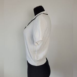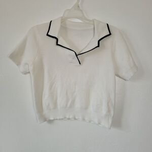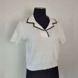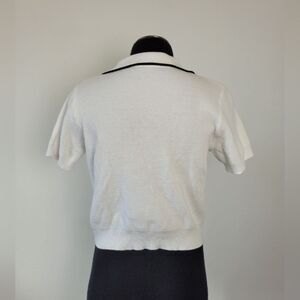 Super cute little sweater with a polo style collar and slightly cropped fit. All white knit with black trim around the collar. Condition is good, there are some blue specks throughout, hard to see in photos but see last photo. No brand, size or material. Measures like a small. Approximately 18.5 inches long 17 inches underarm to underarm laid flat.