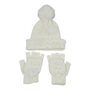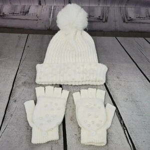 White Knit hat with Super Pom and Faux Pearl Accents Hat and Fingerles Glove set