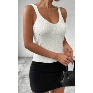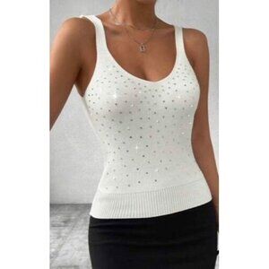 This stylish white knitted sweater with rhinestone embellishment is a must-have for your winter wardrobe. Its chic design and cozy material make it perfect for any occasion.