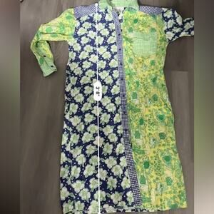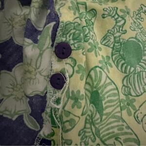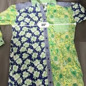 This iconic piece from Lilly Pulitzer's White Label collection exudes timeless charm and embodies the brand's signature style of vibrant colors and playful prints. Crafted with meticulous attention to detail, this shirt dress features a unique patchwork design combining blue and green hues with floral, frog, and gingham prints, creating a whimsical and eye-catching ensemble.