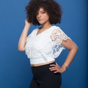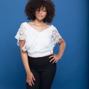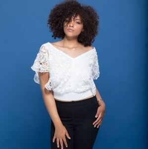 Really cute lace crop. Comfortable with flowing short bell sleeves, not tight or constricting, true to size. Great for spring and the upcoming summer!