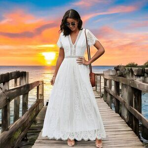 White Lace Flutter Sleeve Embroidered Maxi Dress w/ Scalloped Hem & V‑Neck – S