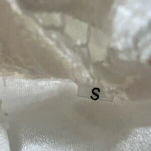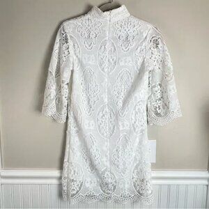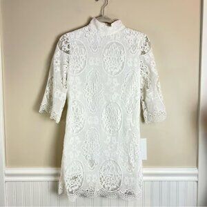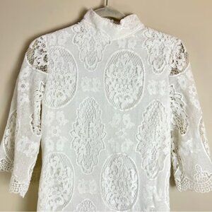 White Lace High Neck Dress Lined Flare Sleeves Scalloped Hem Size Small