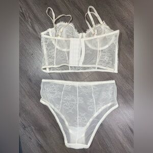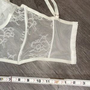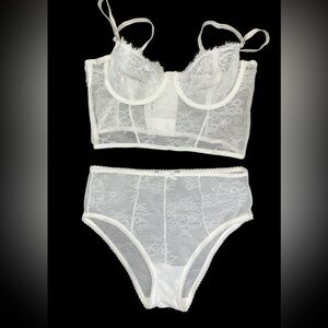 Gorgeous two-piece white lace lingerie set featuring a sheer mesh bustier with underwire cups and adjustable straps. Includes matching semi-sheer lace panties with cotton lining. Elegant floral design—perfect for bridal, boudoir, or romantic occasions. Gently worn and in excellent condition. Bustier measures approximately 12.5” flat across.