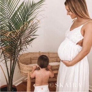 Elegant white maternity dress with floral lace on bodice. Perfect for special occasions. Baby shower