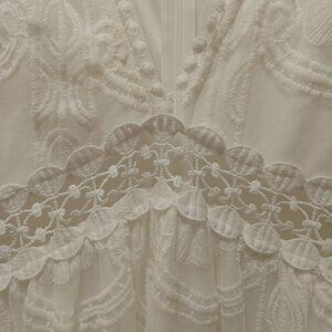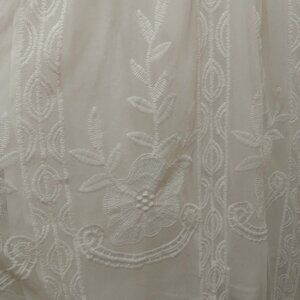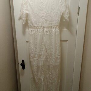 This is a white lace maxi dress with v neck and short sleeves. It has a white polyester under slip that is knee length. Never worn but no tags. Size M. Would make a beautiful wedding dress.