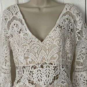 White Lace Overlay V Neck 3/4 Bell Sleeve Boho Cocktail Dress Zipper Back