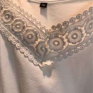 The PERFECT white lace romper for a casual day in the summer, but hey, you can dress it up! only warn once and in great condition! It is a tank top but has sleeves that hits the bottom of your arm which is a perfect touch of detail.