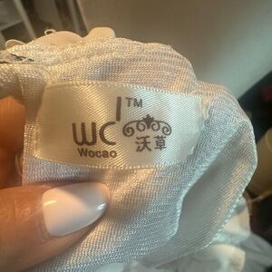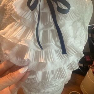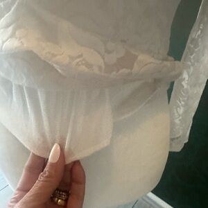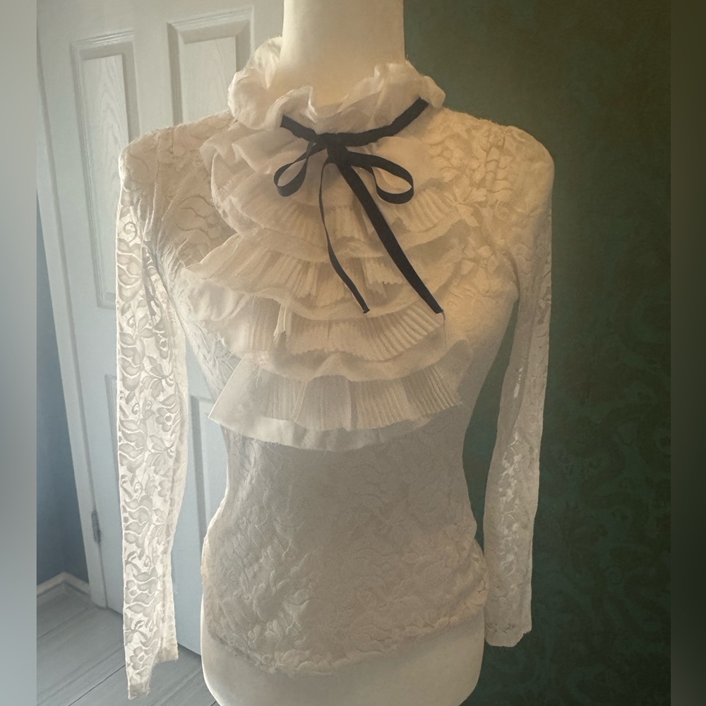 WHITE LACE BLOUSE with a classic touch. Features layered ruffles, lace long sleeve, ties at neck.