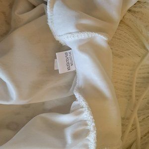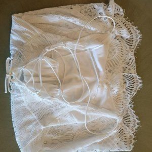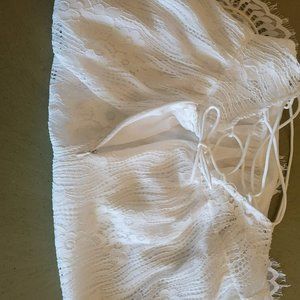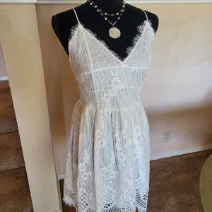 This White Lace Spaghetti Strap style dress is a size medium. This spaghetti strap dress has a beautiful neckline. There is a lace up lower back which adds fun to the dress. The dress is fully lined with a small zipper on the lower back. The material is 35% cotton and 65% polyester. See all the pictures for more details of the lace. Great for summer